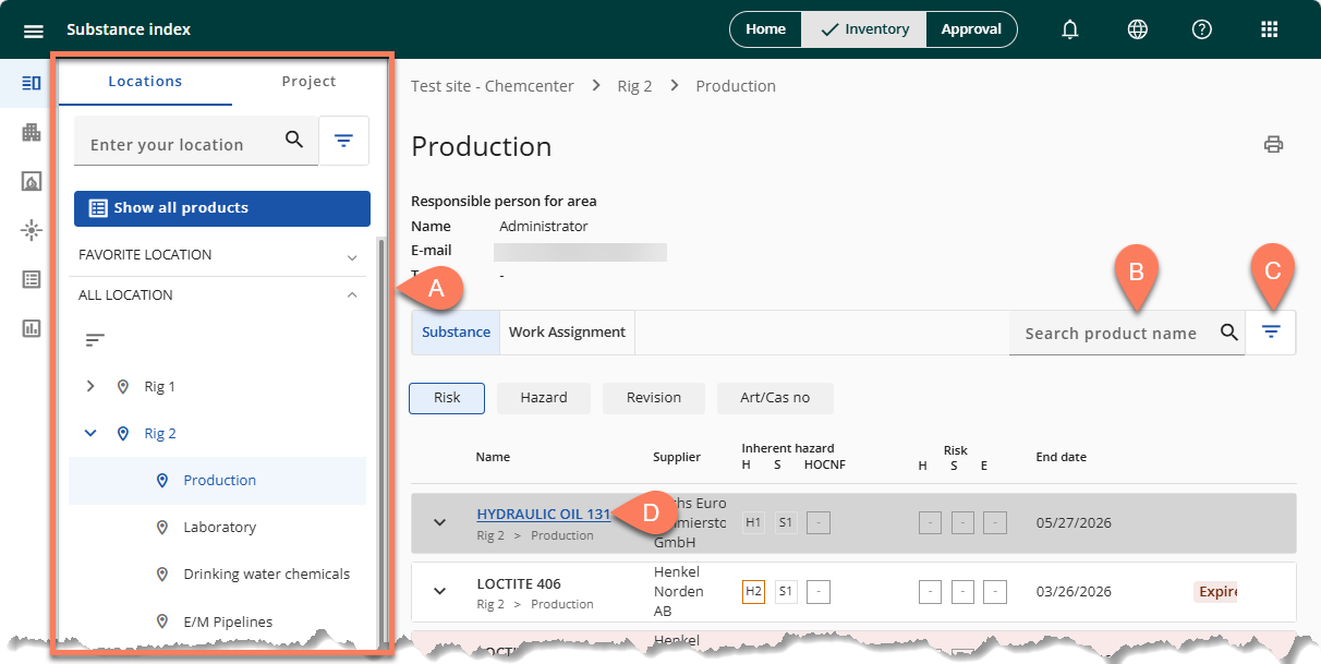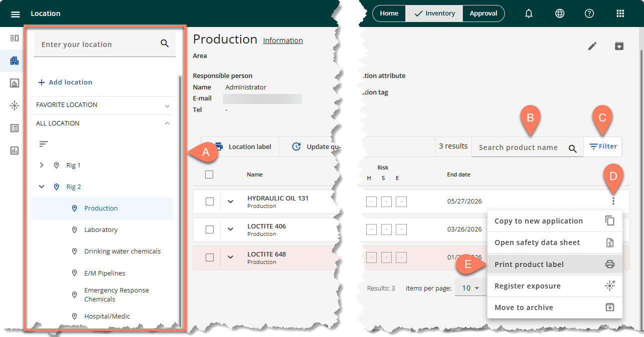 There are two areas in ChemCenter where you can access a product and print its product label. These areas are both in the A Inventory tab: the B Substance Index and the C Location tab.